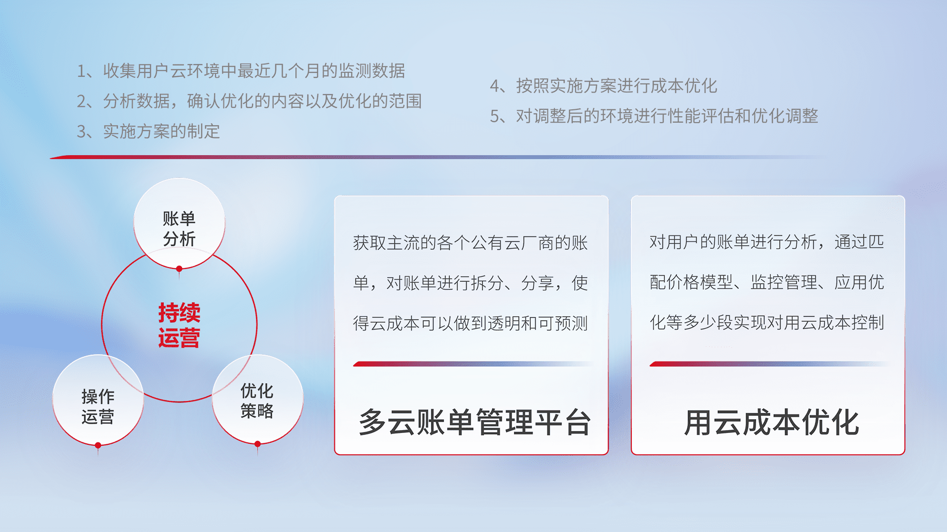 通过多云纳管,,,以统一的资源数据模型把客户的云资源进行抽象和封装,,,,进而实现对多云资源的统一操作,,,保障云资源管理的可靠性、、、、稳定性与可用性。。。。量身定制化运维内容,,,配置、、、、开发运维、、补丁管理、、、备份、、监控、、、认证和访问管理、、、、审计和日常巡检等,,,保障在用云过程中的可靠度,,,,稳定度以及高可用率。。